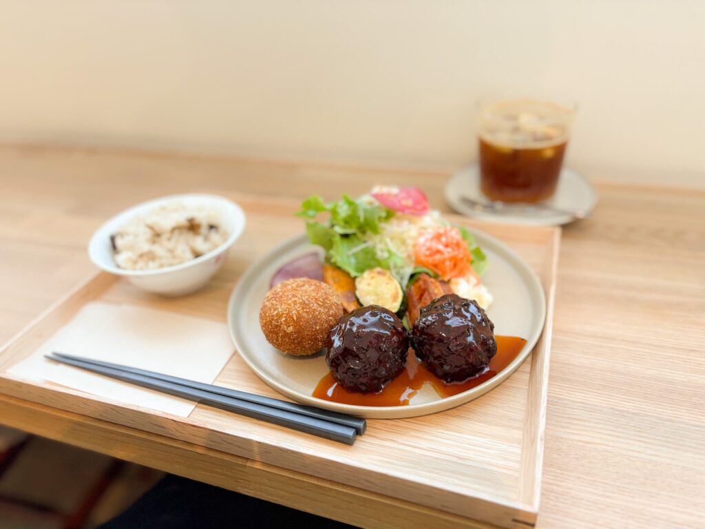お昼過ぎに伺ったのでランチプレートをいただくことに。2種類のメニューがあったが、一つは「えびマカロニグラタンのプレート」、もう一つが「肉団子とコロッケのプレート」だ。筆者がグラタン好きなのでそちらにしようと思ったが、カフェマスターである妻が「コロッケが美味しいらしいから」と迷わず後者を選んだので筆者もそちらにしてみた。