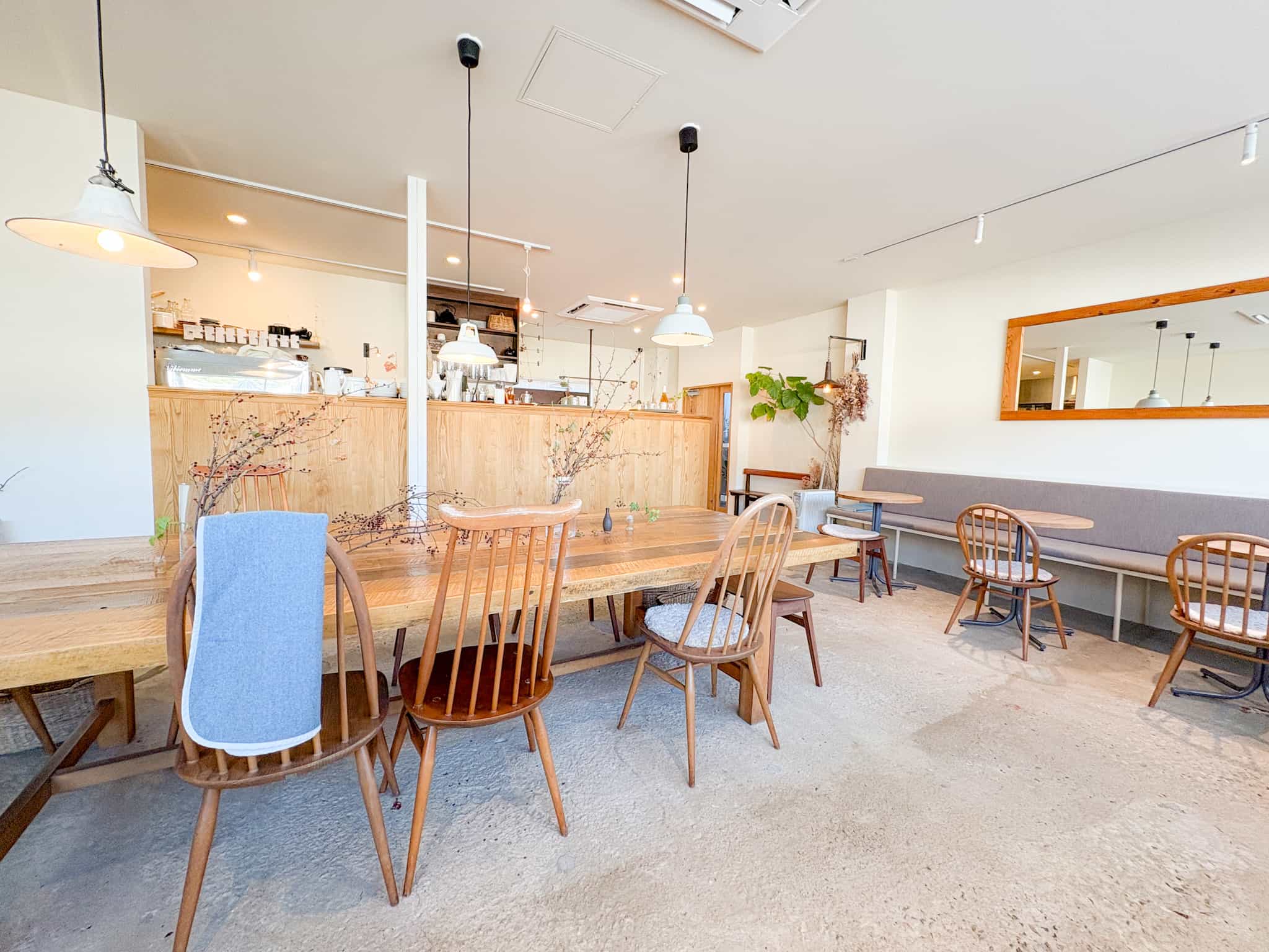 扉を開けると、そこには狭い階段からは想像できないくらい柔らかな光と木の温もりに包まれる落ち着いた空間が広がっている。店内はゆったりとした空間づくりで、カウンター席やテーブル席があり、ひとり時間を楽しみたい場合や友人とのおしゃべり、デートにもぴったりだ。小さいお子様の入店はお断りされているようで、静かに食事や飲み物を楽しむことができる。また、BGMも居心地の良い音楽が選択されており、店前にある池田中央線道路も車は行き交うが走行音はまったく気にならない。